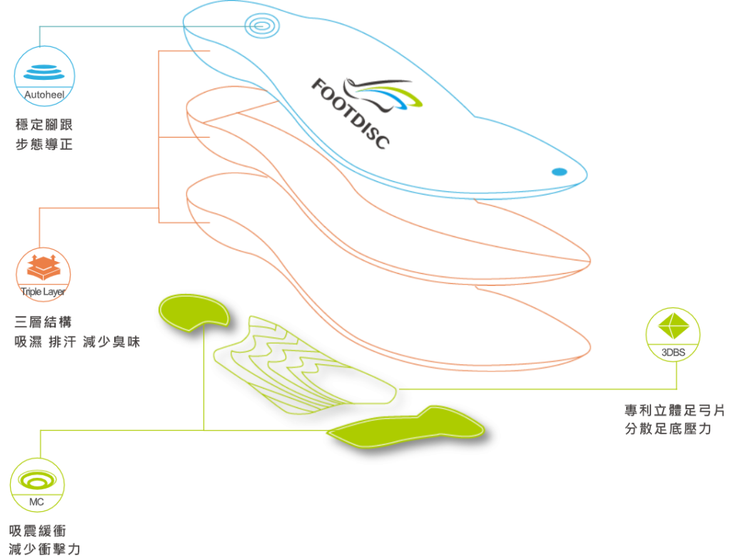 The FOOTDISC insole is equipped with a hard but soft three-dimensional arch piece, which provides complete support, enhances cushioning performance, and dynamically adjusts to a natural gait in accordance with human biomechanics, guiding the distribution of pressure on the foot.